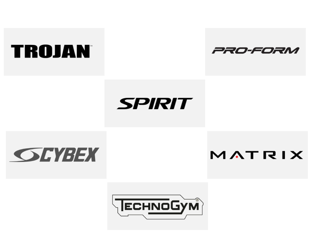 Trojan • Pro-form • Spirit • Cybex • Matrix • Technogym • NordicTrack • Vision • Reebok • Ifit • Star Trac • Horizon • Life Fitness • Landice • Stairmaster • Body Solid • Precor • Concept II